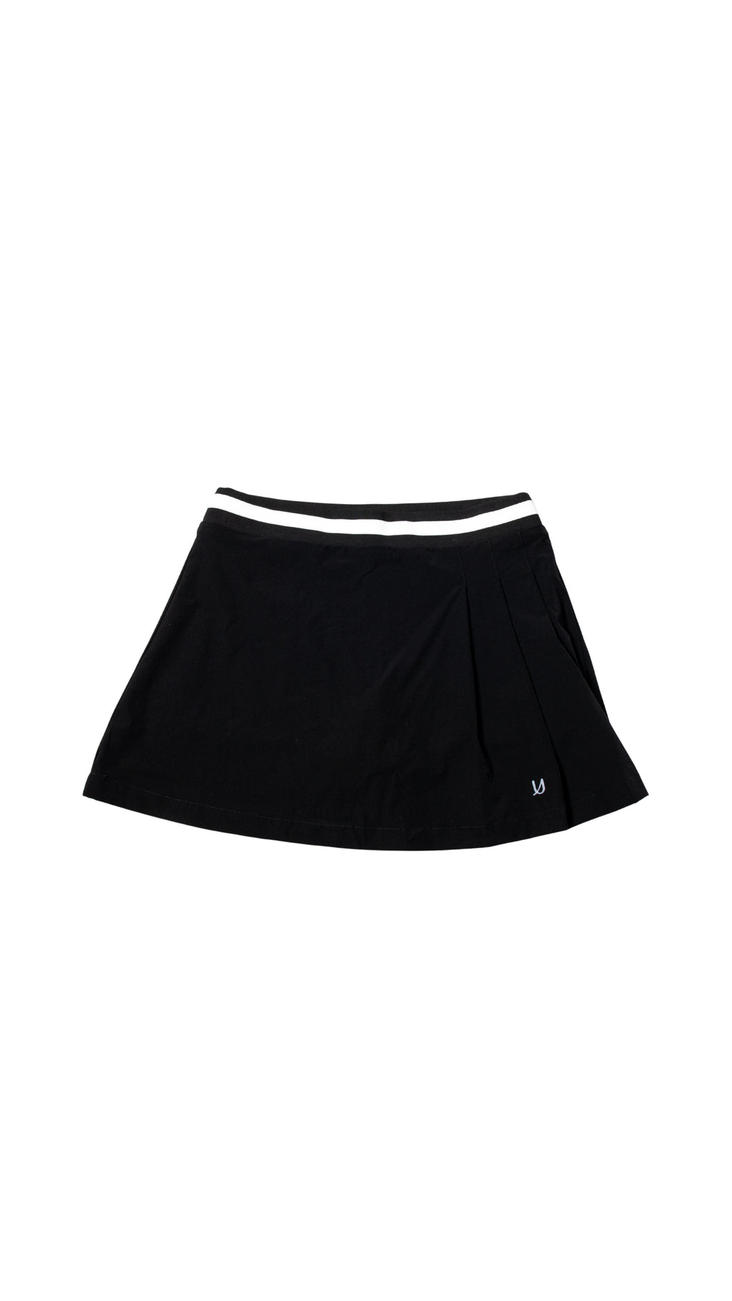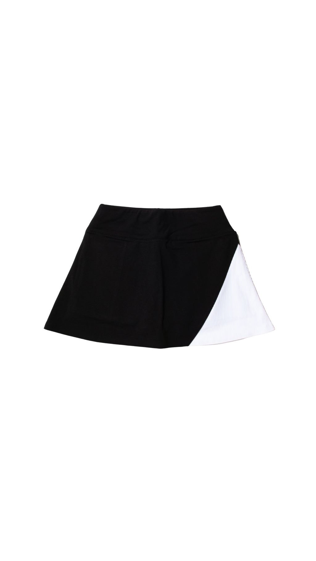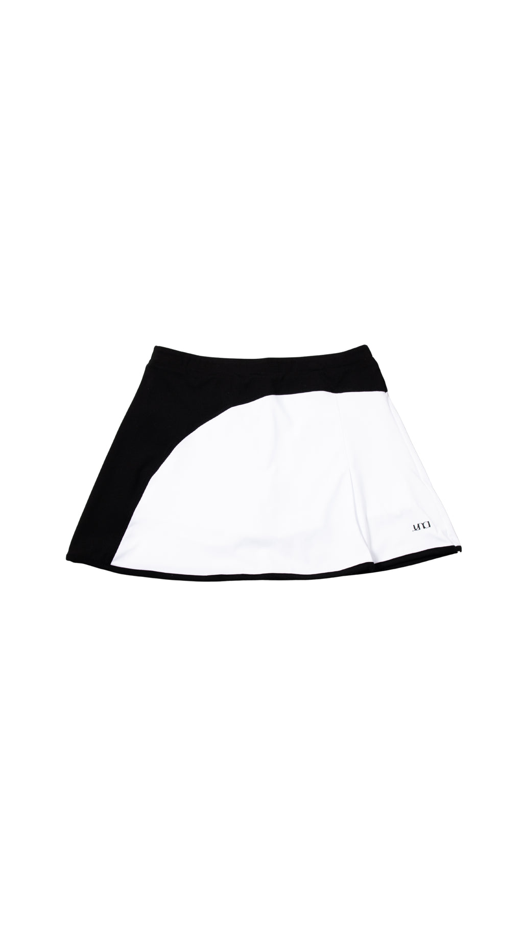 With a black and white arc design, this skirt is a fusion of style and comfort. Featuring a pleat on one side, black piping, and a comfortable waistband, it's designed for both flair and functionality. Complete with undershorts...